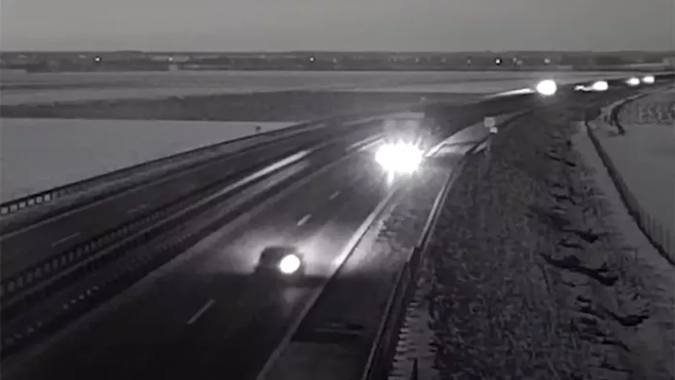 Érkezik egy autó, a bal hátsó lámpája nem világít. Mögötte közelít egy másik autó – a felvételek alapján jóval nagyobb sebességgel. Későn veszi észre az előtte haladó, nem megfelelően kivilágított járművet, megpróbálja menteni a helyzetet, de a hirtelen kormánymozdulat miatt megcsúszik, a szalagkorlátnak ütközik, majd eltalálja az egy hátsó lámpával közlekedő kocsit is.